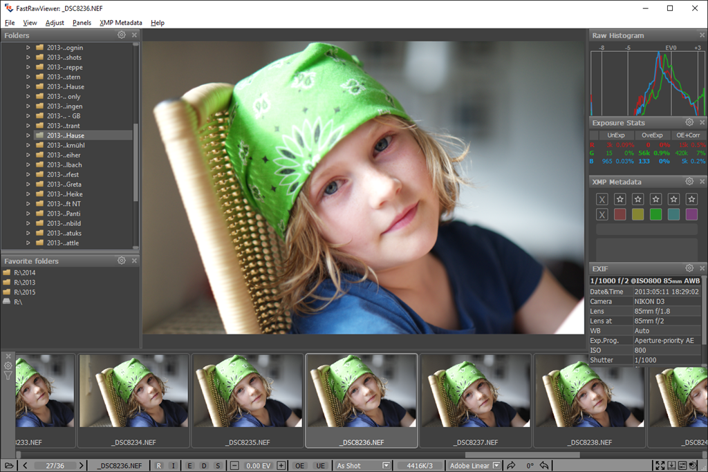 Gut gemacht und flexibel konfigurierbar. die einzelnen Fenster für Folders, Favourits, Raw Histogram, … lassen sich verschieben, so habe ich z.B. die Exif-Daten von Links nach rechts geschoben um mehr Platz für die Folders (Ordner) zu haben.