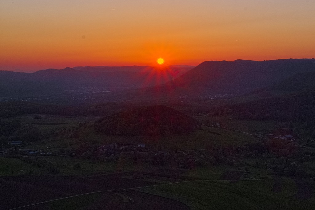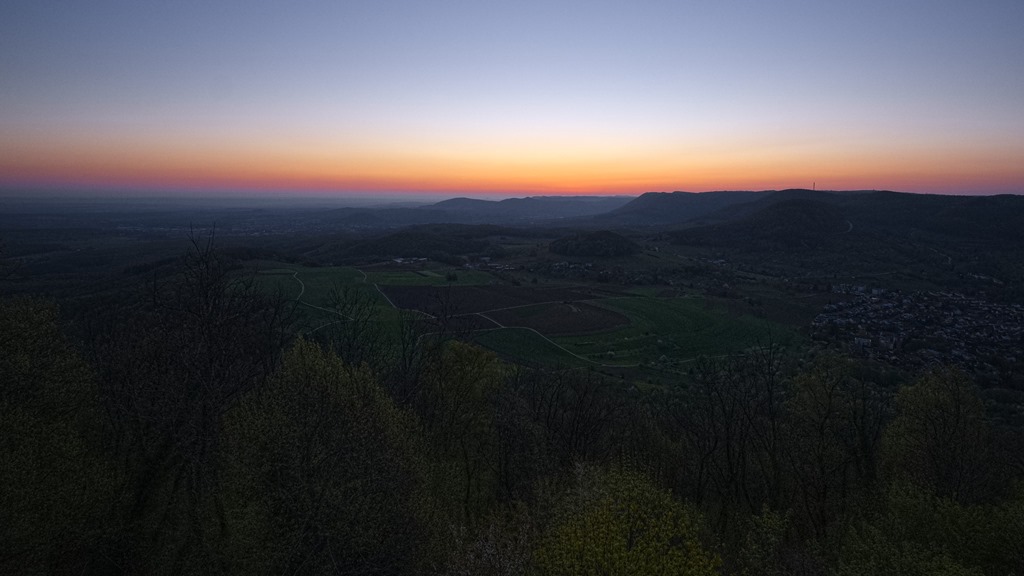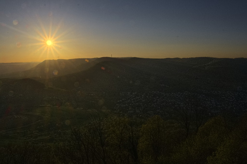 Wichtig dabei ist, dass man sich den Stand der Sonne vergegenwärtigt. Sonnenuntergänge über der Alb sind von der Achalm, wenn überhaupt, nur im Winter möglich. Sonnenaufgänge dagegen vom Frühjahr bis in den Herbst hinein. An Himmelfahrt war eine geschickte Gelegenheit, das Wetter passte vor allem und so war ich in der Lage einen Sonnenaufgang über der Alb zu fotografieren.