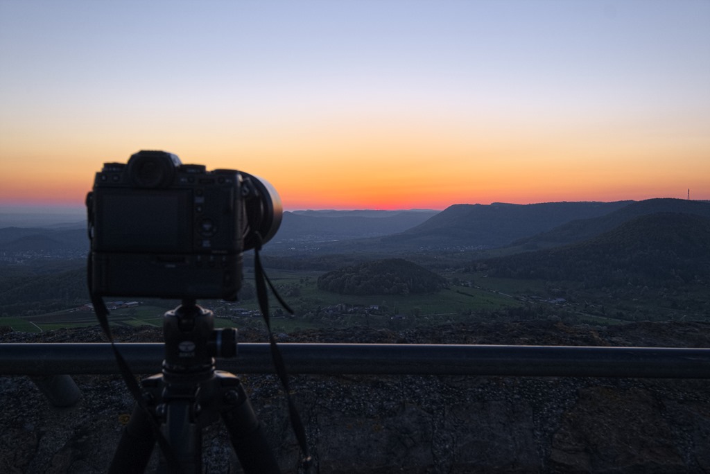 Berge und Gebirgszüge muss man eigentlich immer aus einiger Entfernung fotografieren. Für einen Sonnenunter- oder auch -aufgang, können dabei unterschiedliche Perspektiven reizvoll sein. Bei Bergen ist es für mich die, wo ich den Berg in Augenhöhe oder sagen wir, nicht ganz aus dem Tal fotografieren kann. Nehmen wir uns einen der großen Berge, dann ist dieser Ansatz mit relativ viel Aufwand verbunden, da man entweder in ein Fluggerät oder aber auf einen anderen ähnlich hohen Berg steigen muss. Für die Alb als Mittelgebirge gilt das auch – dabei kann man den Albrand selbst nutzen, oder aber einen der vor der Alb stehenden Zeugenberge erklimmen. Die Achalm bei Reutlingen ist so ein Zeugenberg und bietet eine hinreichend hohe Position für das Ablichten der Alb.