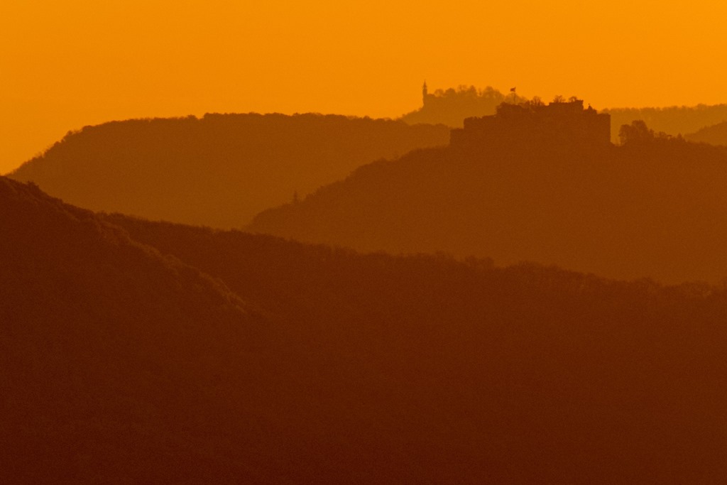 Das die Teck und der Hohen Neuffen von der Achalm fast in einer Fluchtlinie liegen, habe ich nur zufällig entdeckt und damit gleich meine nächste Idee gefunden, die Sonne direkt aufgehend hinter diesen beiden Burgen.