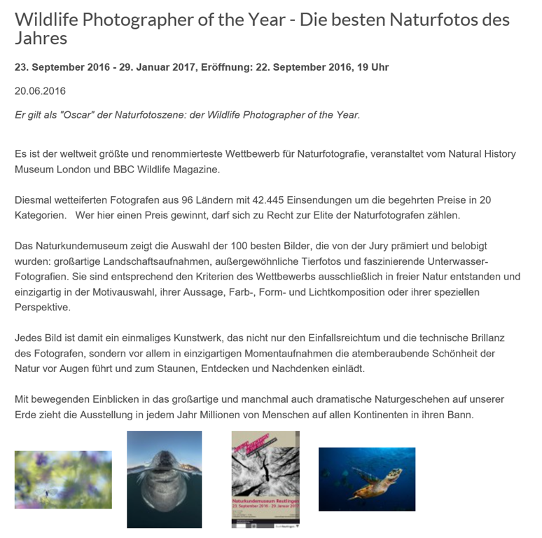Die Bilder des Wildlife Photographer of the Year Wettbewerbs sind ab dem 23. September 2016 bis zum 29. Januar 2017 im Naturkundemuseum in Reutlingen zu sehen,