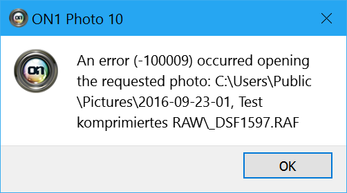 Der RAW-Konverter muss mit diesem neuen Format umgehen können. Es reicht also nicht aus, wenn die RAW-Dateien der Fuji X-T2 oder X-Pro2 unterstützt werden, es muss eine explizite Unterstützung von komprimierten RAW sichergestellt sein. Capture One 9.x (Stand September 2016) unterstützt zum Beispiel komprimierte RAWs der Fujis nicht! Genauso wenig wie ON1 Photo 10, welches die Entwicklung unter folgender Fehlermeldung versagt.