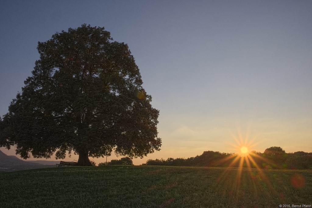 Bilder wie dieses haben das Problem, dass zum einen ein gestaltendes Element (die Sonne) sehr hell ist und zum anderen unser eigentliches Motiv (der Baum) im Schatten liegt.