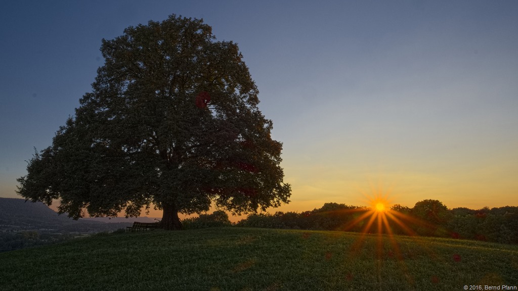 Zuerst einmal ein Bild in dem versucht wurde, die Wiese und die Zeichnung im Baum halbwegs zu erhalten, was natürlich zu ausgefressenen Lichtern in Bereich der Sonne geführt hat.