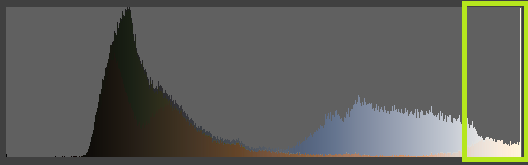 Das Histogramm zeigt auch deutlich den überbelichteten Bereich (rechts, grün markiert – der Ausschlag ist zwar schmal geht aber bis ganz nach oben).