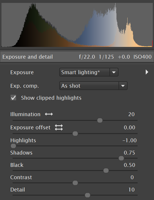 Dazu noch das Histogramm mit den Einstellungen für die Belichtung.