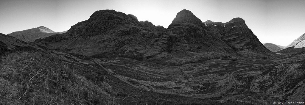 … ein Panorama aus dem schottischen Glencoe. The Three Sisters, wie die Berggruppe auch genannt wird. Aus 8 Einzelaufnahmen und zu einem Panorama hochkant montiert, anschließend in Affinitiy Photo bearbeitet und mit DxO Filmpack in die Fujifilm Acros Simulation konvertiert.