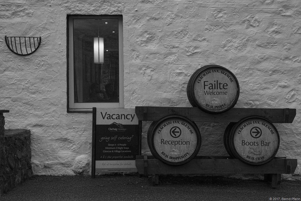 Kurz nach 7 am Abend lässt mich mein Chauffeur springen, am Clachaig Inn – mitten im Glencoe, dort wo schottische Bergsteigerlegenden geboren wurden und ich die nächsten Tage fotografieren darf, also irgendwo im Nirgendwo.