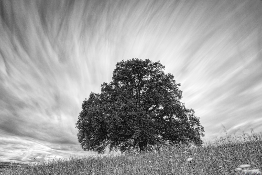 Wenig oder keine Sonne hat den Vorteil, dass der Dynamik-Bereich im Bild kleiner ausfällt und damit der Baum und die Wiese im Vordergrund besser mit Farben und Konturen zu Geltung kommen. Abschließend stellt noch die Richtung, in der sich die Wolken bewegen, einen wichtigen Faktor dar. Wie im Bild zu sehen ist, kamen die Wolken in einem Winkel von ca. 30° auf mich zu, damit konnte ich diesen dynamischen Effekt aufnehmen, welcher nicht vorhanden ist, wenn die Wolken quer über das Bild ziehen.