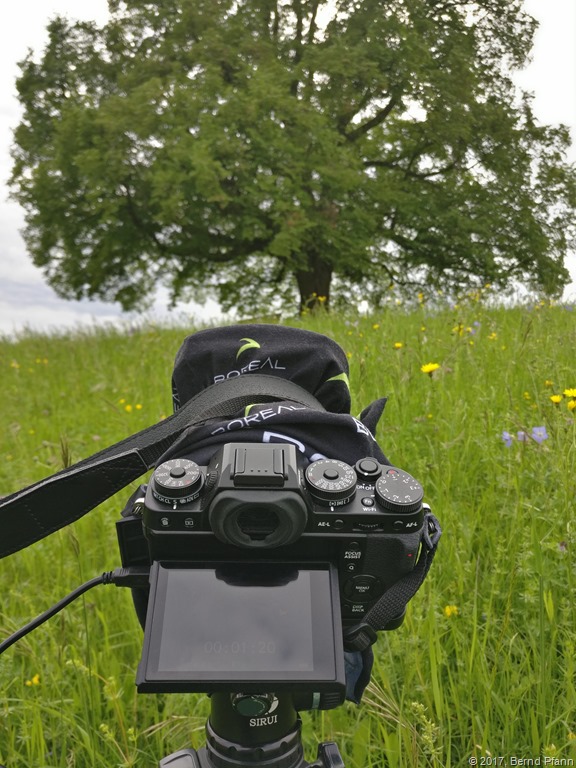 Da ich mit der Wiese im Vordergrund den Frühling mit einbeziehen wollte, habe ich mein Stativ recht tief auf den Boden gestellt … das Gras war gut 40cm hoch und das Stativ hier nicht viel höher … ca. 60-70cm werden es wohl gewesen sein. Ich kniete hinter der Kamera, was mit einer ISO-Matte auch bei einer feuchten Wiese ohne Probleme geht. Eine zusätzliche und sehr hilfreiche Unterstützung lieferte noch das klappbare Display der Kamera.