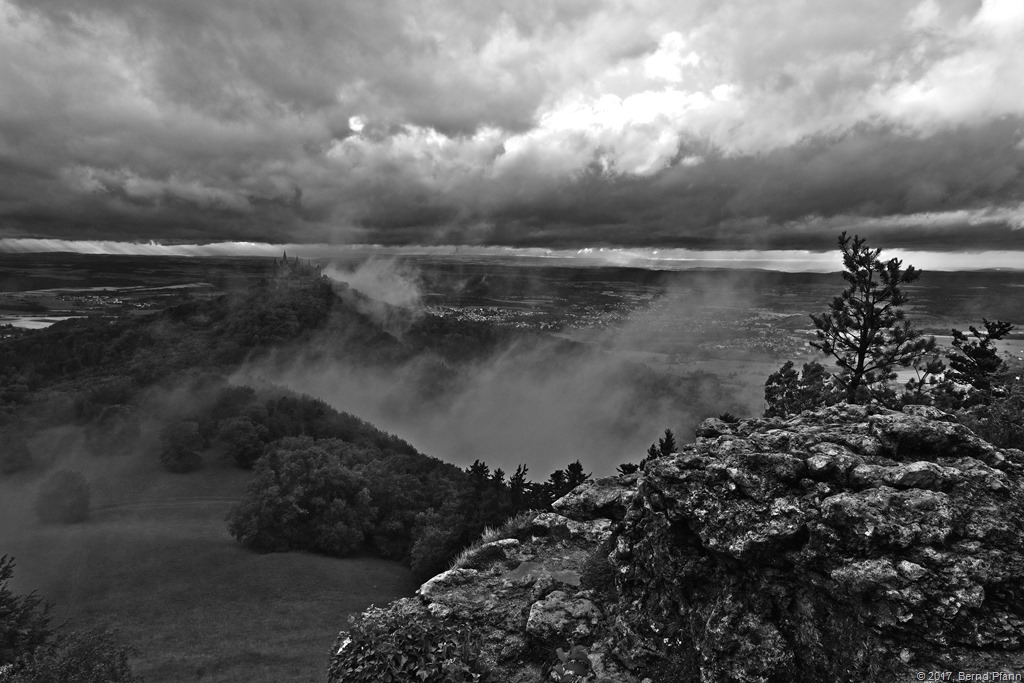 Aber wie heißt es so schön, erstens kommt es anders und zweitens als man denkt. Für Fotografen bedeutet das eigentlich immer, was macht das Wetter?! War das Wetter am Wochenende davor noch wirklich Klasse, wurde Gewitter und starker Regenschauer für den Mittwochabend vorhergesagt. Nun tue ich mich als Landschaftsfotograf immer schwer, bei unsicheren Verhältnissen, einen Workshop oder ein eigenes Projekt zu verschieben. Einfach aus dem Grund, dass wenn es nicht wie aus Kübeln schüttet, gerade in den Grenzbereichen des Wetterwechsels interessante Bilder entstehen können, die oft schöner oder spannender sind als bei stahlblauen, wolkenlosen Himmel. So saßen wir also zu viert im Auto und fuhren von Reutlingen in Richtung Hechingen, alle mit der Hoffnung das es vielleicht doch noch was werden könnte, aber so richtig glauben daran, wollte niemand. Von Hechingen aus konnte man die Burg nicht einmal sehen und der Scheibenwischer lief stellenweise auf Stufe drei. Mein Ausweichplan war, wir trinken halt irgendwo ein Bier … unser Fahrer der Werner meinte „so schlecht hat der Wetterbericht gar nicht ausgeschaut“, Martin wiederum bemühte das Regenradar auf dem Smartphone und Michael war eher nachdenklich … Wenn der Schwabe nicht weiterweiß, dann schaut er mal … (jetzt gucka mr a moal) … vielleicht klappt es ja doch. Ich hatte die ganz kleine Hoffnung vielleicht ein Wolkenfenster zu bekommen, so ein kleines halt … wie sehr meine Mitstreiter dem Wetterbericht trauten, sah man an der Ausrüstung. Noch nie hatten alle Teilnehmer im Workshop Regenhüllen und Regenschirme dabei, wir rechneten alle mit dem Schlimmsten.