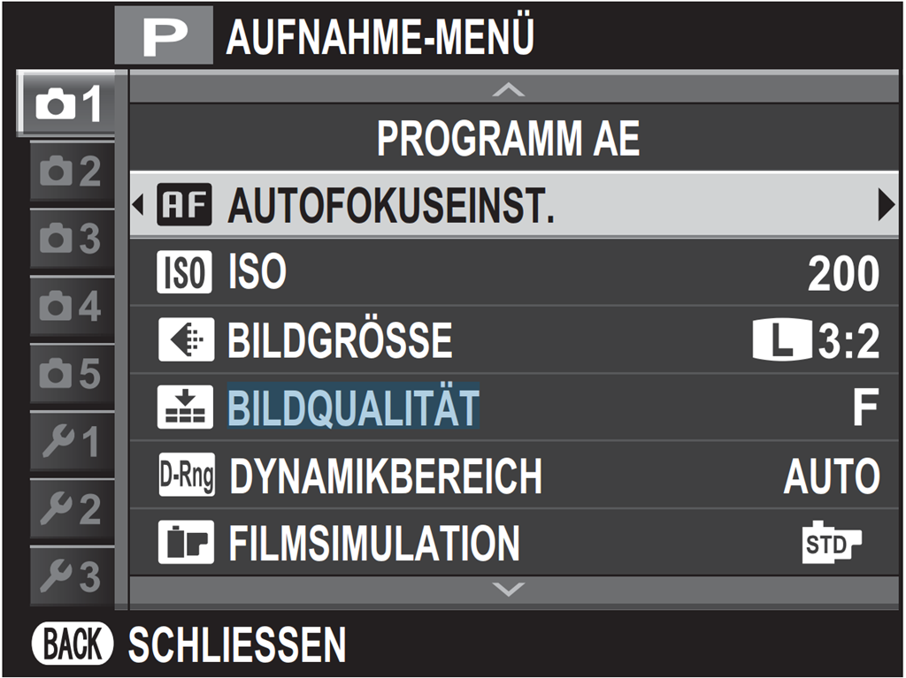 Das Menü und die Einstellung BILDQUALITÄT sieht dann wie folgt aus F(ine), bzw. N(ormal).