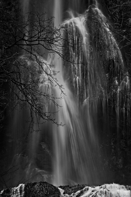 Zumal bedingt durch das letzte Licht des Tages und der Lage des Wasserfalls im Wald die Stimmung mystisch wurde. Verwendet man dazu noch eine längere Brennweite und ein Stativ lassen sich faszinierende Details am Wasserfall festhalten.