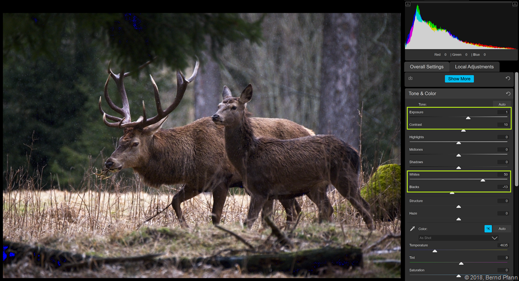 Zur Anpassung der Tonwerte ziehe ich bei gedrückter J-Taste den Regler für die Tiefen (Blacks = -13) soweit nach links bis erste kleine Bereiche Blau markiert werden. Genauso verfahre ich mit dem Regler für die Höhen (Whites = 50). Nun erfolgt noch die Anhebung des Kontrasts (Contrast = 10) und damit haben wir den folgenden Stand.