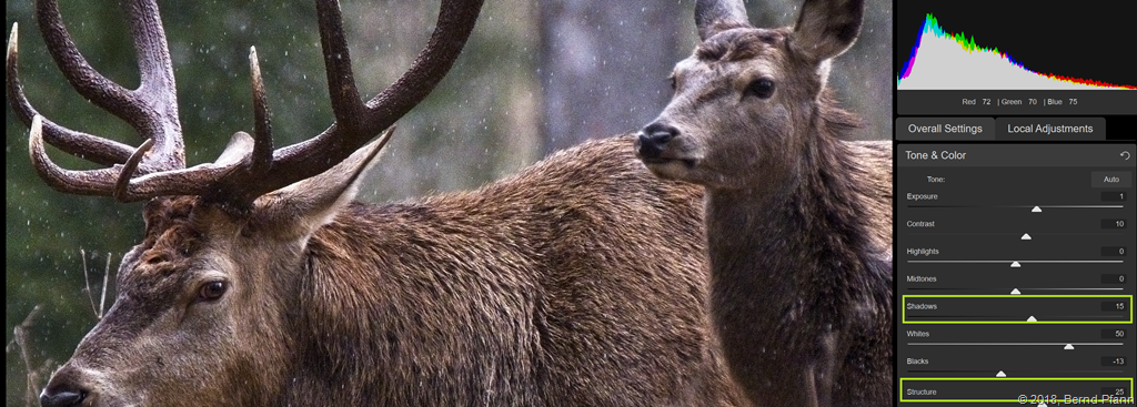 Die Überbelichtungswarnung der Höhen erfolgt übrigens durch Bereich die Rot markiert werden. Ausgehend von diesem Stand, bearbeite ich nun die Schatten und den Mico-Kontrast.
