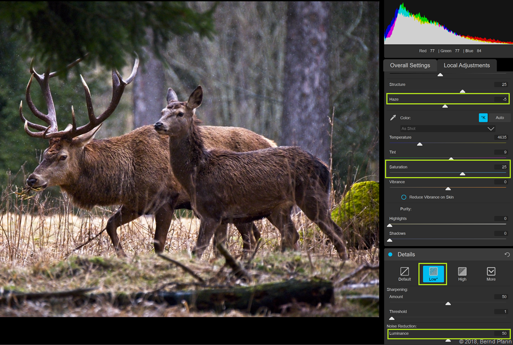 Zum Schluss kommt nun das Schärfen des Bildes an die Reihe. Dazu wähle ich unter Details den Preset Low aus (Sharpening / Amount = 50; Sharpening Threshold = 1; Noise Reduction / Luminance = 15 und Detail / Color = 5) und da ich noch gerne etwas gegen das Rauschen tun möchte, erhöhe ich Luminance von 15 auf 50 (Noise Reduction / Luminance = 50).