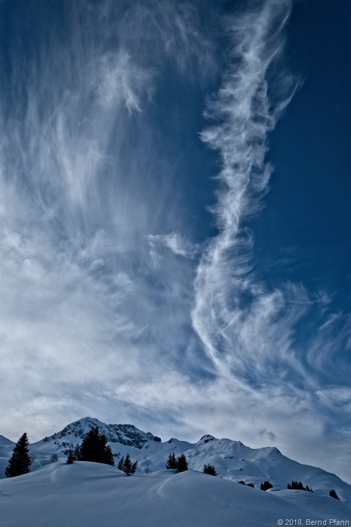 Natürlich gibt es auch am Rückweg noch viele interessante Motive und Perspektiven, so dass ich mich entscheide an einem der darauffolgenden Tage gegen später, mit den Skiern zum „Schloss“ in Oberlech und auf das Auenfeld auf zu steigen, um dort am späten Nachmittag das besser werdende Licht nochmals zu nutzen. Hier kann ich auch wieder meine Vorliebe für lange Brennweiten in der Landschaftsfotografie nachgehen.