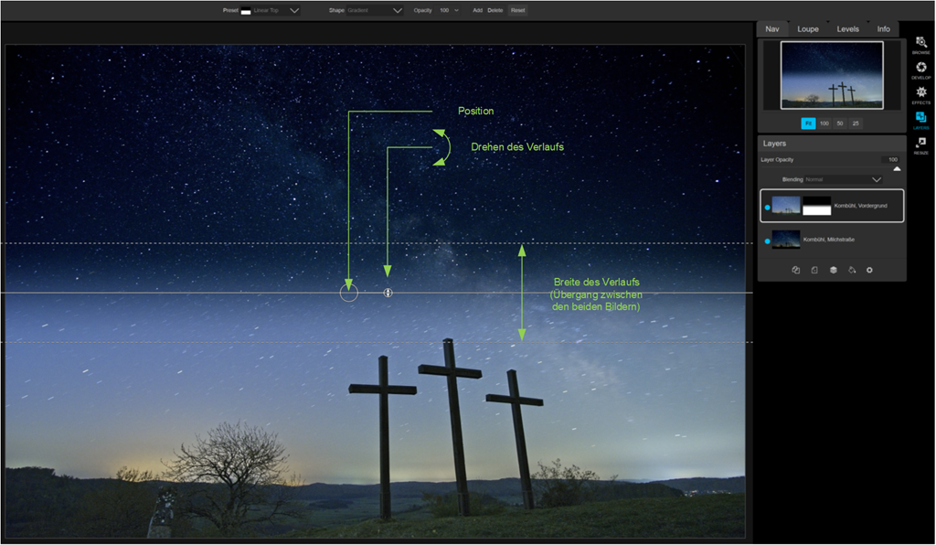 Im nächsten Schritt wird die Verlaufmaske (die mittlere Linie mit dem Kreis) annähernd auf den Horizont im Bild gezogen, dabei wird immer mehr von der Milchstraße (Ebene Kornbühl, Milchstraße) sichtbar.