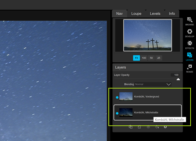 Add as Layer ist hier die richtige Auswahl für die Zuweisung zu jeweils einer Ebene. Damit ich mich bei einem späterem öffnen des Bildes einfacher zurechtfinde, aber auch für die aktuelle Bearbeitung – ist es hilfreich die beiden Einzelaufnahmen sprechend zu benennen, zum Beispiel mit Vordergrund und Milchstraße.