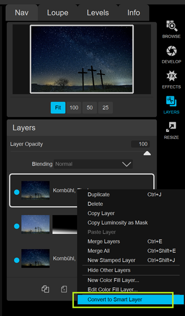 Im nächsten Schritt, wird eine dritte Ebene erstellt die im Anschluss mit den weiteren Modulen von ON1 Photo RAW (DEVELOP oder EFFECTS) weiterbearbeitet werden kann. Dazu wählen wir beide bestehenden Ebenen aus und erzeugen mit der rechten Maustaste New Stamped Layer (STRG-SHIFT-J) die dritte Ebene welche auch gleich mit einem neuen Namen versehen wird (Kronbühl, Final). Abschließend muss noch die Konvertierung in einen Smart Layer (Convert to Smart Layer) erfolgen, welcher die weitere Bearbeitung ermöglicht.