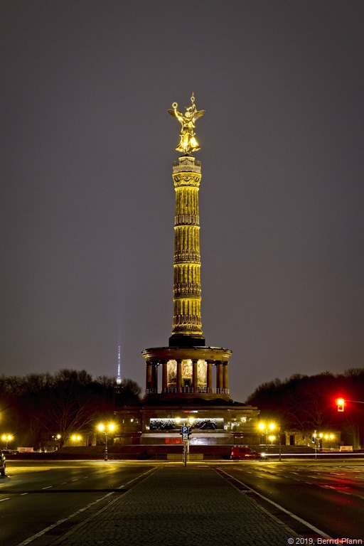 Ursprünglich unterwegs zum Brandenburger Tor, musste ich am Abend des ersten Januars die Lokation mit Maßen von Dixi-Klos teilen, welche von der Party in der Silvesternacht zeugten. Dieses Motiv entsprach nicht meinen Erwartungen und damit bin ich weiter zur Siegessäule am Tiergarten gefahren.