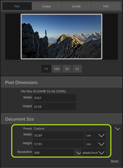 - Unter Document Size im Feld Width wird nun die gewünschte Größe (grün) eingegeben, in meinem Fall 100cm, alle weiteren Werte berechnet ON1 Photo RAW davon abhängig automatisch (blau).