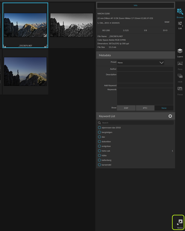 - Auswahl des Bildes im Browse Modul und laden des Resize Moduls (das geht mit der Y-Taste oder durch Klick auf Resize am Bildschirmrand rechts unten