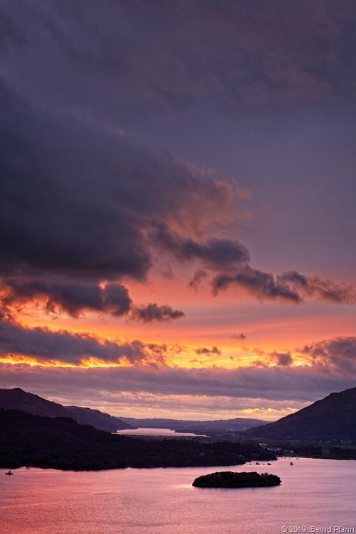 Mitte Juni, in einer eigentlich für Fotografen weniger optimalen Zeit, bekommt man die Chance den Sonnenuntergang von Surprise View direkt über dem Cat Bells fotografieren zu können. So weit nordwestlich steht die Sonne nur zu dieser Jahreszeit, und durch den Untergang gegen 21:40 Uhr kann die Fotografie auch bequem nach dem Abendessen erfolgen. Die langen Tage haben damit auch ihre Vorteile, solange man nicht einen Sonnenuntergang und gleich darauf einen Sonnenaufgang kombinieren will.
