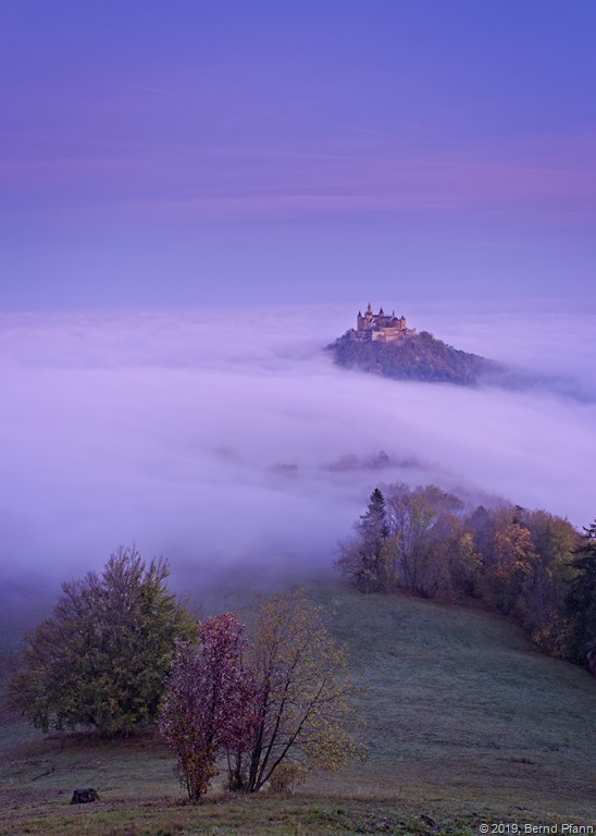 Eine knappe halbe Stunde vor Sonnenaufgang, zur blauen oder besser gesagt violetten Stunde zeigt sich der Hohenzoller über dem noch ruhigen Nebelmeer.