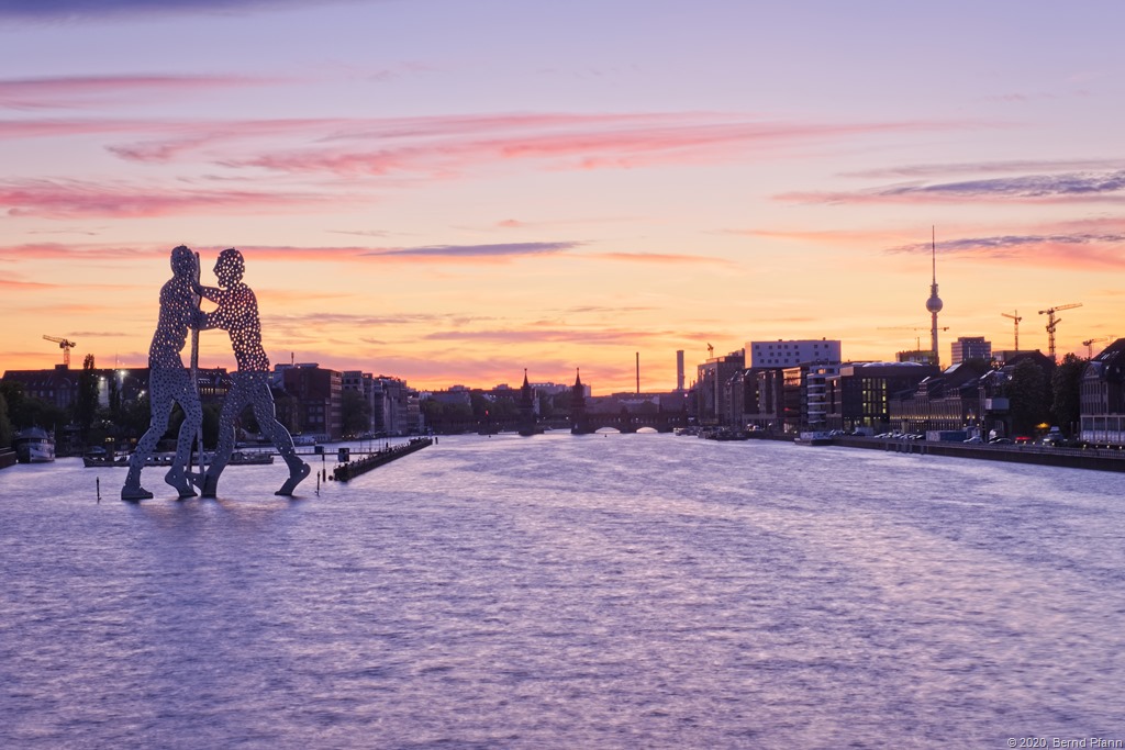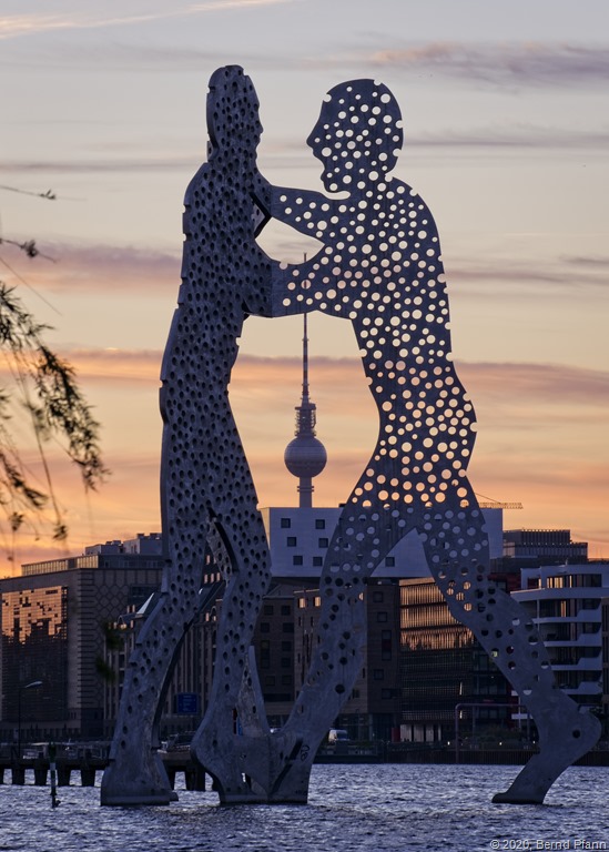 Mitten in der Spree, steht in der Nähe der Treptow-Towers der Molecule Man, ein wirklich monumentales Kunstwerk, das auch für Fotografen ein reizvolles Motiv darstellt. Mit ein bisschen Glück fängt man die Sonne hinter den Mannen ein.