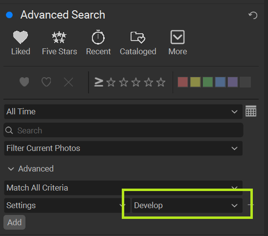 Das ist möglich in dem man den Advanced Search Filter verwendet und bei der Auswahl Match All Criteria, Settings und Develop wählt.