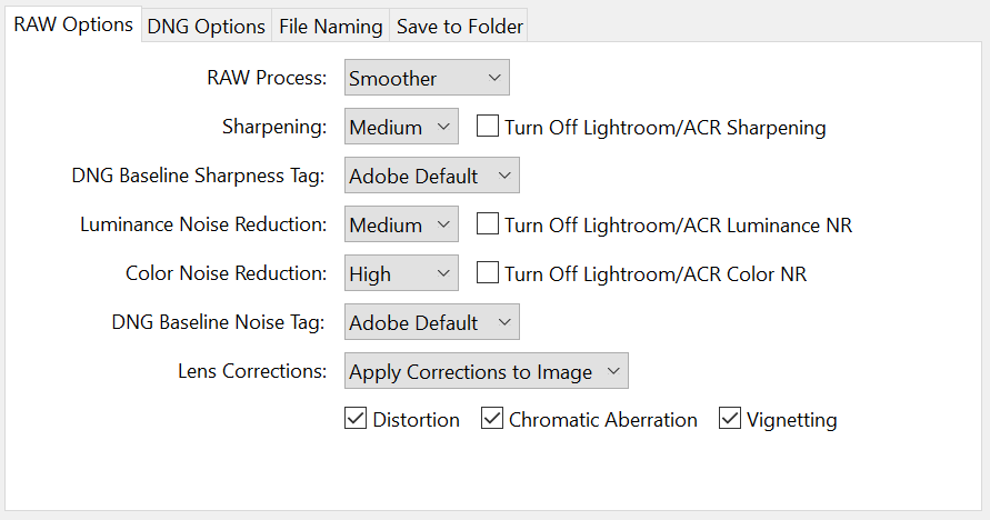 Durch einen Klick auf Process Photos kann im folgenden Auswahldialog die RAW-Entwicklungs-Methode (RAW Processing) und das Ausgabeformat (Output Format) gewählt werden und damit haben wir auch alle Einstellmöglichkeiten betrachtet.