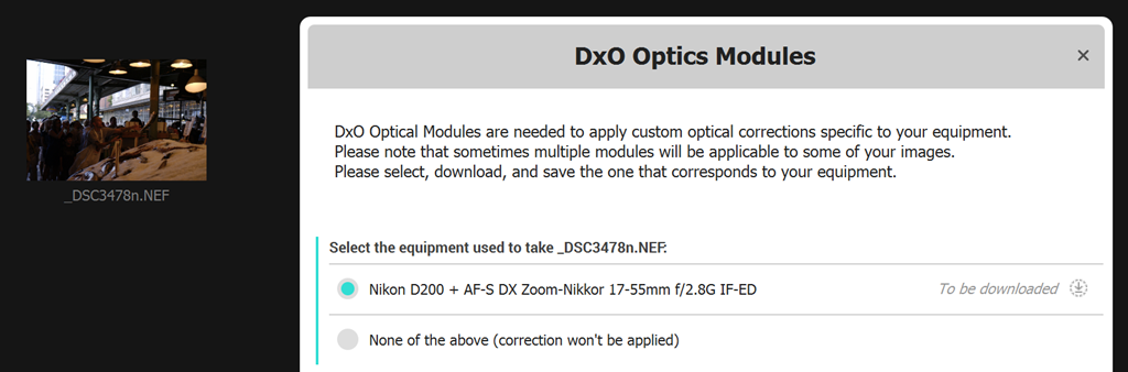 Nach dem Laden der Datei in DxO PureRAW wird versucht die Kamera und das verwendete Objektiv zu erkennen, was in diesem Fall auch gelingt. Das dafür vorhandene Modul muss nun heruntergeladen werden damit die notwendigen Korrekturen erfolgen können.