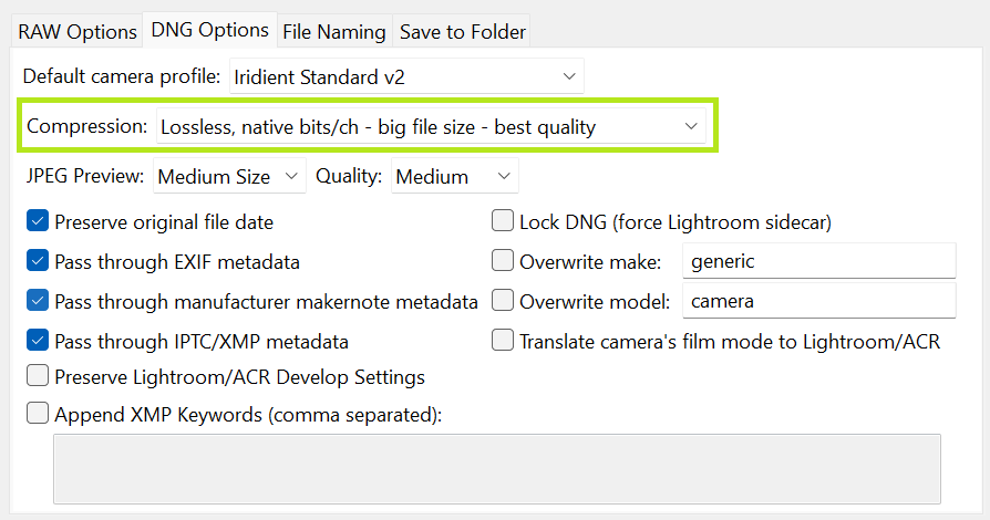 Zusätzlich, habe ich in den DNG Options als Compression die Einstellung Lossless, native bits/ch … gewählt.
