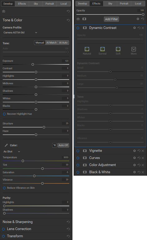 - Develop / Tone & Color / Camera Profile: Camera STIA-Std