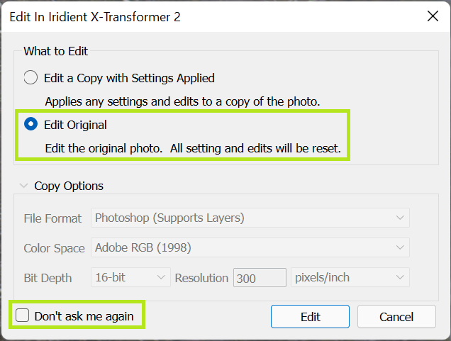 Zum Abschluss bleibt nur noch die Frage, in welcher Form den die RAW-Datei an den X-Transformer zu übergeben ist. ON1 Photo RAW bietet hierzu zwei Möglichkeiten. Da wir nur die RAW-Datei in ein DNG Umwandeln und erst danach weitere Bearbeitungsschritte durchführen werden, ist die Option Edit Original die passende. Der Iridient X-Transformer verwendet nun den geladenen Preset (bzw. wird mit dem letzten geladenen Preset gestartet) und führt die Konvertierung durch.