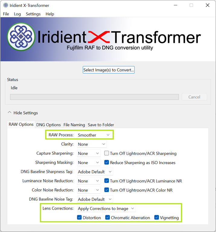 Der Preset für den Iridient X-Transformer besteht aus der Einstellung für den RAW Process (Interpretation der Sensor-Daten in RGB Farben), die hier auf Smoother steht und der Lens Corrections (Korrektur von Abbildungsfehlern des verwendeten Objektivs) welche durch den X-Transformer in das DNG geschrieben werden in Verbindung mit der Verzeichnung (Distorion), der Chromatischen Aberration (Chromatic Aberration) und der Vignettierung (Vignetting).