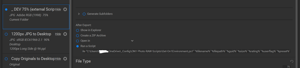 # Eintrag des PowerShell Skriptes in den Export-Dialog - <USERNAME> mit dem Benutzernamen ersetzen PowerShell.exe -File "C:\Users\<USERNAME>\OneDrive\_Config\ON1 Photo RAW Scripts\Get-On1Environment.ps1" '%filename%' '%filepath%' '%guid%' '%size%' '%rating%' '%userflag%' '%preset%'