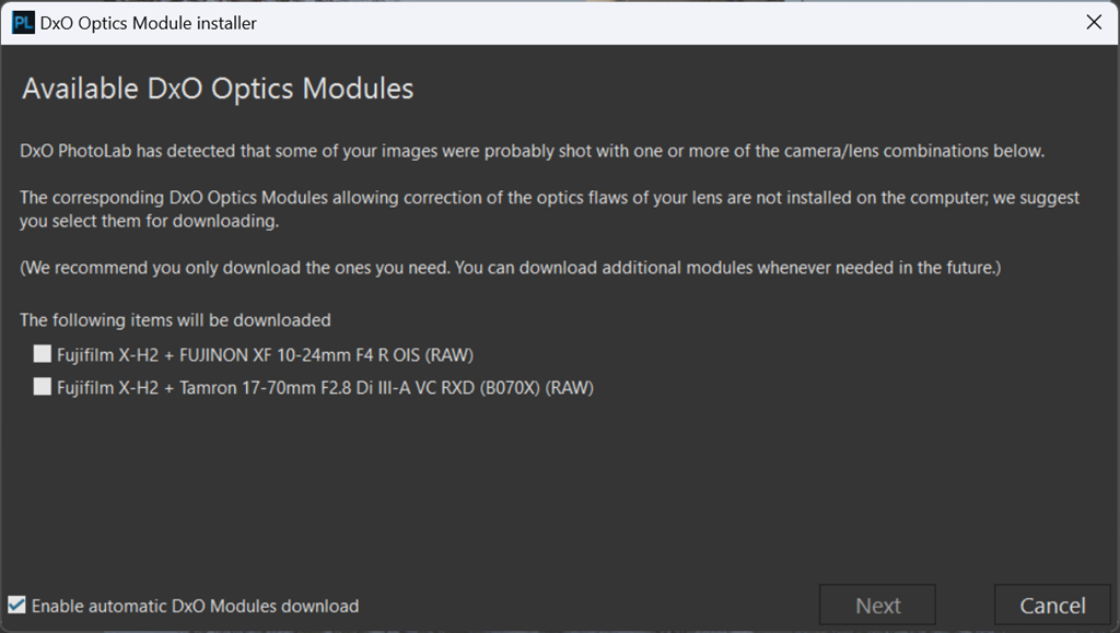 Ab diesem Zeitpunkt freut sich DxO eine bekannte Kamera gefunden zu haben und bietet die Möglichkeit zum Download der optischen Module an.