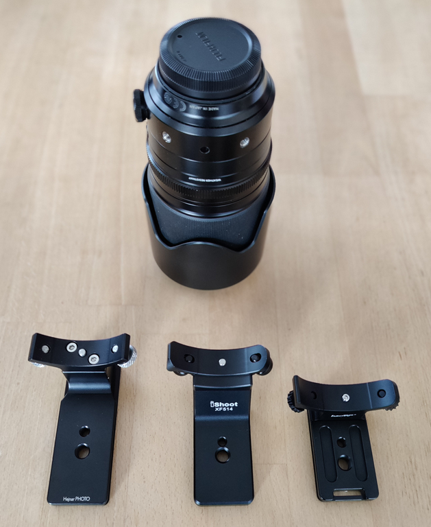 Das Bild oben zeigt, von links nach rechts alle drei vorhandenen Objektiv-Füße, die ein Arca-Profil besitzen. Startend mit dem, nicht mehr für die X-H2s + VG-XH passendem Hejnar-Modell, in der Mitte dann der iShoot der analog zum originalem Fujifilm ebenfalls schräg verläuft bis zum rechten, von Haoge produziertem Fuß.