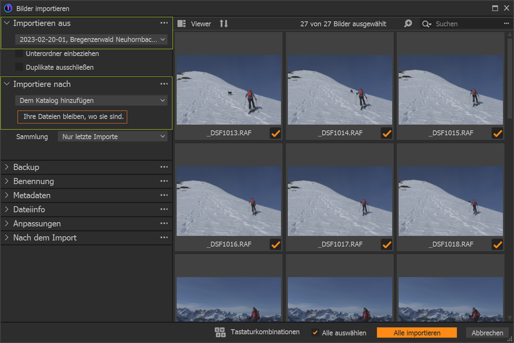 Die 2te Möglichkeit entspricht exakt der Vorgehensweise wie wir mit RAW- und Bild-Dateien verfahren müssen, wenn wir diese schon auf dem Computer in einem Verzeichnis gespeichert haben. Hier werden die RAW-Dateien nicht nochmals kopiert, sondern lediglich in die Datenbank von Capture One aufgenommen also indiziert und dem Katalog hinzugefügt, aber an ihrem originärem Speicherort belassen.