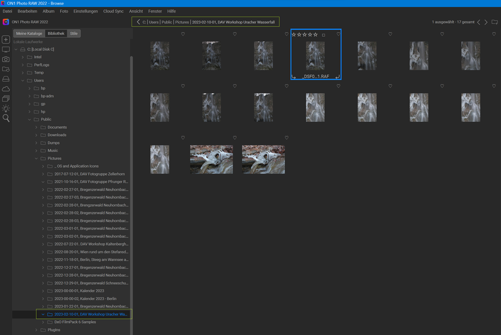 Dem Beispiel aus diesem Blog folgend, finden wir die RAWs vom Uracher Wasserfall in folgendem Ordner: