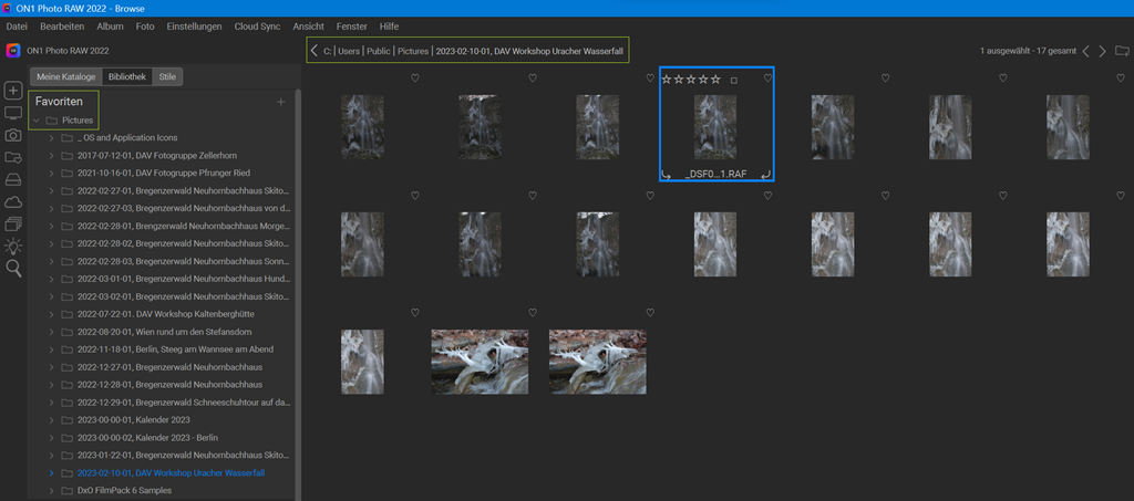 Wem das zu unübersichtlich ist, der kann sich den Ordner Öffentliche Bilder in die Favoriten von ON1 Photo RAW hinzufügen, was den Rest des Dateisystems ausblendet.