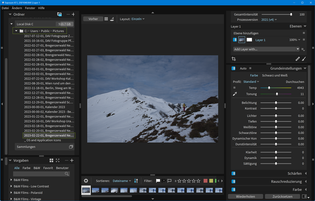 Exposure X7 arbeitet wie versprochen mit seinem Catalog Free Workflow im Dateisystem.