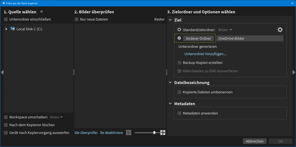 Somit wird ein Verzeichnis zum Import der RAW-Dateien erstellt. Von der Option die Dateien nach dem Import von der Speicherkarte zu löschen, muss ich dringend abraten. Genauso will ich das Thema umbenennen von RAW-Dateien beim Import nochmals separat thematisieren, vor allem mit dem Hintergrund einer möglichst großen Redundanz und Sicherheit für die Bilder.