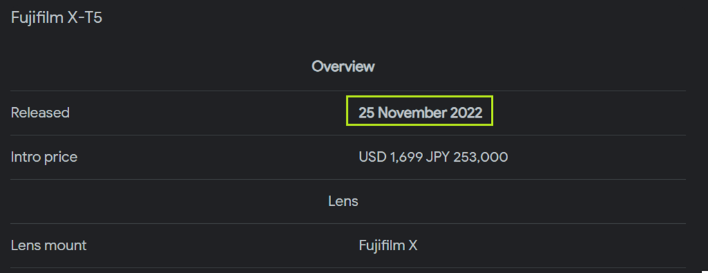 Spannender wird es, wenn man sich die Seriennummer der X-T5 (Serial Number: 2D000914) anschaut. 2D könnte dann 2012 und Q4 bedeuten, was aber nicht korrekt ist. Hier ist 2022 und Q4 der richtige Zeitraum. Wir müssen also wissen, wann eine Kamera auf den Markt gekommen ist, um das richtige Jahrzehnt zuordnen zu können.