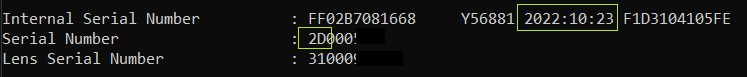Die Bestimmung des Produktionsdatums ist dagegen wesentlich einfacher. Bei Kameras ist es direkt in den EXIF-Daten als Zeitstempel im TAG Internal Serial Number enthalten. Bei Kameras und Objektiven kann auch die am Gerät angebrachte Seriennummer entschlüsselt werden.