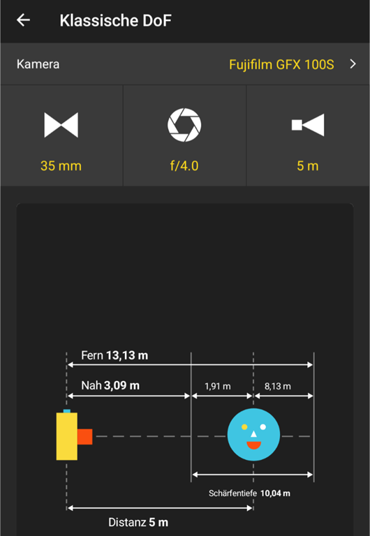 Als Basis habe ich die Fujifilm GFX100s genommen und da zeigt sich bei einem Abstand von 5m und Offenblende ein Schärfebereich von gut 10m.